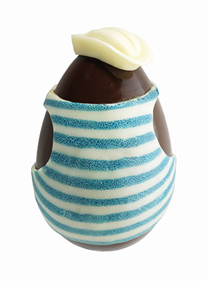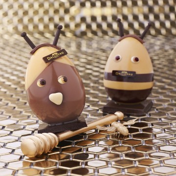 Œuf Monsieur Pâquin ou Mademoiselle Pâquinette : existe en taille 10 cm (poids 100 g) au prix de 34 euros et en taille 15 cm (poids 250 g) au prix de 59 euros, sur la boutique en ligne et dans tous les points de vente Dalloyau.