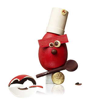 Le Chef pâtissier Claude Ducrozet de l’Hôtel Fouquet’s Barrière a imaginé un œuf de Pâques malicieux tout droit sorti des cuisines, clin d’œil aux petits chefs en herbe. Sur un socle de chocolat noir décoré d’une spatule et d’un macaron tout chocolat, trône un drôle d’œuf toqué aux couleurs du Fouquet’s. Composé de trois couches successives de chocolat noir et blanc, il renferme des petits sujets de Pâques feuilletés chocolat noir et lait.